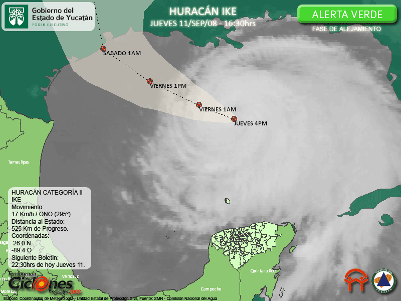 Distancia del centro del huracán al Estado de Yucatán: 525 Kms. de Progreso