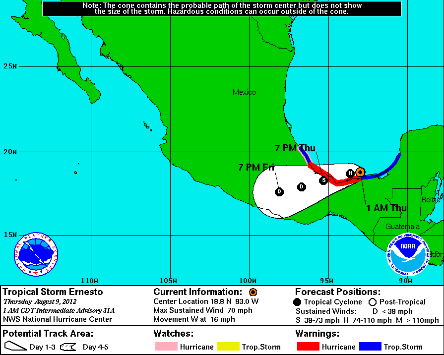 Es posible que Ernesto se desplace sobre el Estado de Veracruz en las inmediaciones de los Tuxtlas, entre Coatzacoalcos y Veracruz, Veracruz durante el día mañana Jueves cerca del medio día ó antes como un Huracán de Categoría UNO en la Escala Saffir Simpson de Ciclones Tropicales.