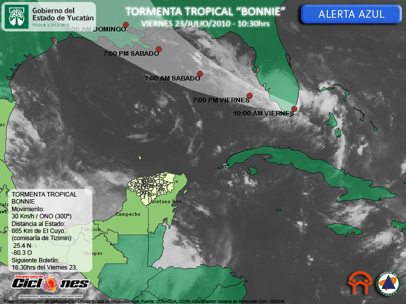 El Centro de la Tormenta Tropical Bonnie se encuentra a 865Km de El Cuyo, Comisaría de Tizimin. y a 785 Km de Isla Contoy, Quintana Roo.