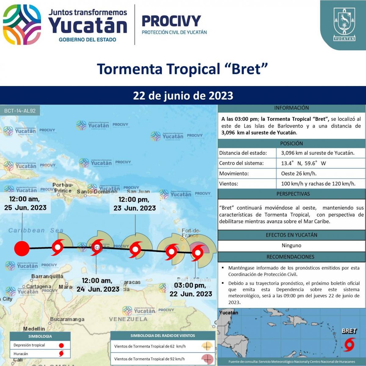 "Bret" continuará moviéndose al oeste, manteniendo sus características de Tormenta Tropical, con perspectiva de debilitarse mientras avanza sobre el Mar Caribe.