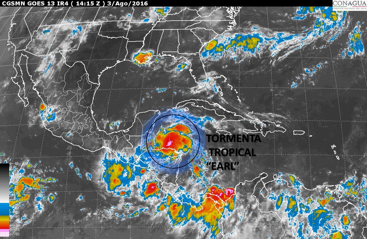 LA TORMENTA TROPICAL EARL MANTIENE SU DESPLAZAMIENTO HACIA EL OESTE APROXIMANDOSE AL TERRITORIO NACIONAL, SUS BANDAS NUBOSAS EXTERIORES FAVORECEN AL INCREMENTO DE POTENCIAL DE LLUVIAS DE MUY FUERTES (50 A 75MM) SOBRE LA PENINSULA DE YUCATÁN Y SURESTE DE CHIAPAS, VIENTO FUERTE EN LAS INMEDIACIONES DEL SISTEMA Y OLEAJE ELEVADO EN LAS COSTAS DE QUINTANA ROO.