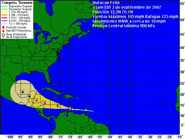 Se pronostica que el Huracán "Félix" Cat. II, continúe su trayectoria hacia el Oeste-Noroeste, con probables cambios en su intensidad, y podría convertirse en un Huracán mayor (Cat. 3) en las proximas 12 horas.