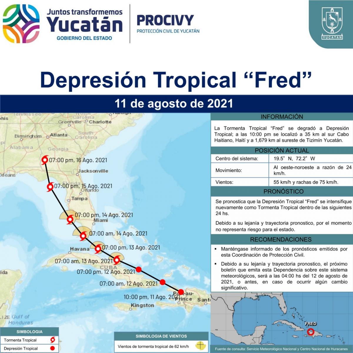 La Tormenta Tropical Fred, se degradó a Depresión Tropical; se localiza a 35 km al sur de Cabo Haitiano, Haití y a 1,679 km al sureste de Tizimín, Yucatán.