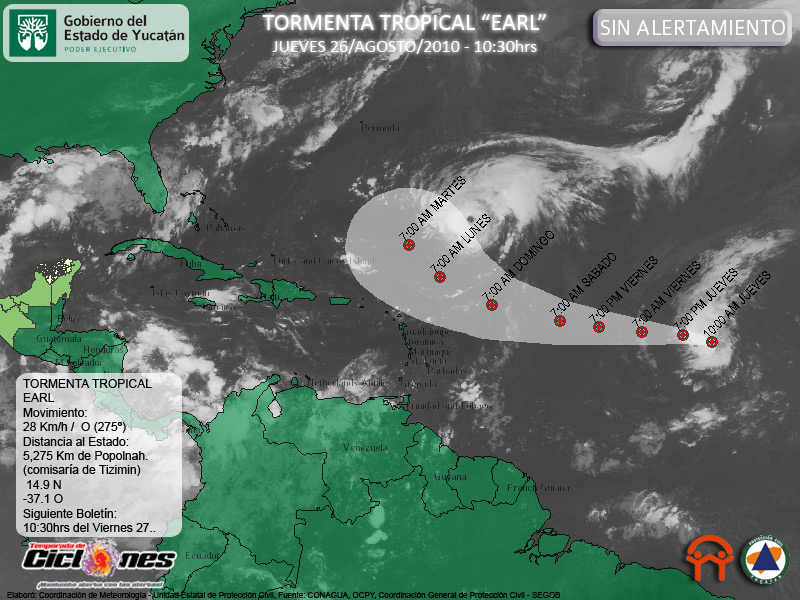 Se espera que Earl continúe con un desplazamiento general hacia el Oeste durante los próximos días, y que permanezca en la Categoría de Tormenta Tropical posiblemente hasta el día Sabado.