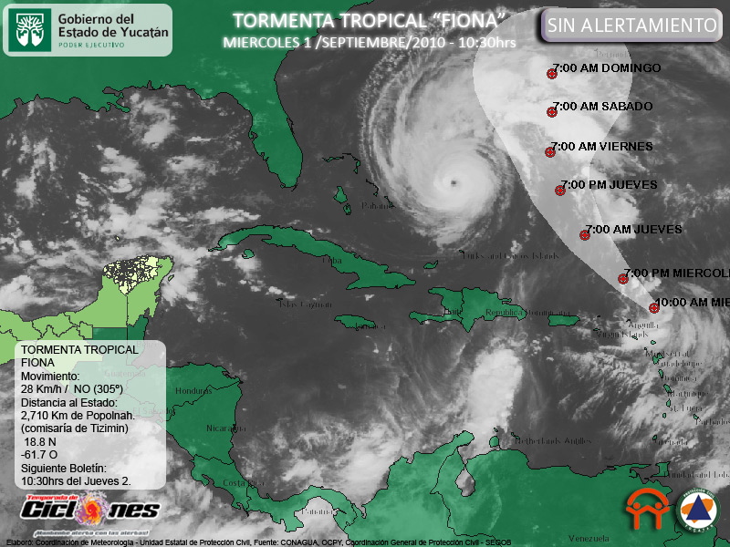 Se espera que la FIONA permanezca en la Categoría de Tormenta Tropical durante los próximos días y que continúe presentando un desplazamiento hacia el Nor-Oeste ó Nor-Noroeste, trayectoria en la cual la Península de Yucatán se encuentra fuera de Peligro.