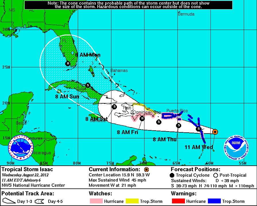 La Tormenta Tropical Isaac continuaría desplazándose hacia las Antillas menores, donde se espera que su centro se desplace durante hoy por la noche, para posteriormente adentrarse al Mar Caribe, desplazándose al Sur de Puerto Rico durante el día de mañana y posiblemente impactando República Dominicana y Haiti durante el día Viernes.