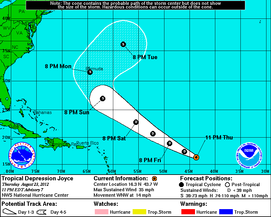 La Tormenta Tropical Joyce se ha degradado a una Depresión Tropical sobre aguas abiertas del Océano Atlántico.
