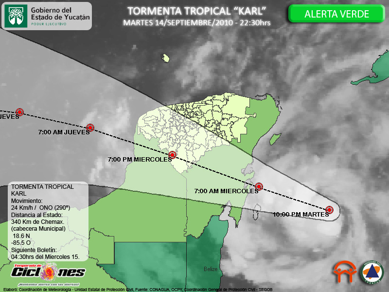 Karl se desplaza de acuerdo a los pronósticos, mejora un poco en su estructura, mantiene vientos de 75Km/h con rachas de hasta 95Km/h, su centro se estima a 290Km de Chetumal, Quintana Roo, 340Km de la Cabecera Municipal de Chemax, Yucatán y a 395Km de la Cabecera Municipal de Peto, Yucatán.