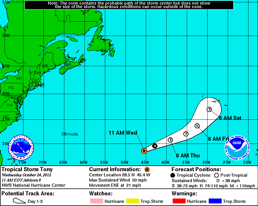 La Depresión Tropical #19 se ha intensificado desde el día de Ayer a la Tormenta Tropical Tonny Sobre el Océano Atlántico Norte, sin amenazar al Continente.