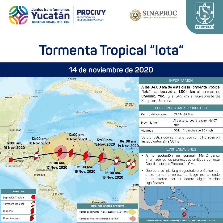 La Tormenta Tropical Iota; se localiza a 545 km al sur-sureste de Kingston, Jamaica.