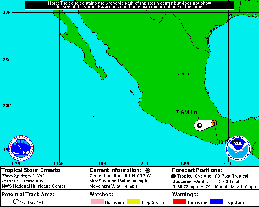 Debido a la Orografía de la Región en que se encuentra la Tormenta Tropical Ernesto continuará debilitandose gradualmente durante las proximas horas, esperando se convierta en una Depresión Tropical durante las próximas 12hrs, sin embargo aún persiste el potencial de precipitaciones fuertes a localmente intensas en todo el Sureste del País y la Península de Yucatán