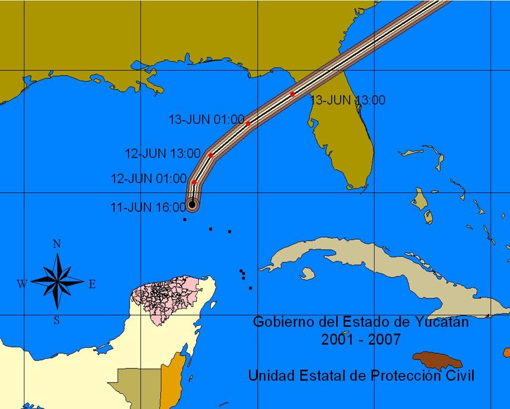 Distancia del centro de la tormenta tropical al Estado de Yucatán: 312 Kms. de Las Coloradas, Río Lagartos