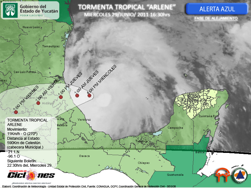 Arlene continúa aproximandose al Norte de Veracrúz, sin embargo, importantes desprendimientos de lluvia se concentran en la Península de Yucatán, a pesar de que la Tormenta Tropical continúa alejandose de la Península, un desprendimiento de lluvia cubre la Zona Urbana de Mérida, así como la Zona Costera Comprendida entre el Puerto de Progreso y el Puerto de Sisal y el Sur de Nuestra entidad.