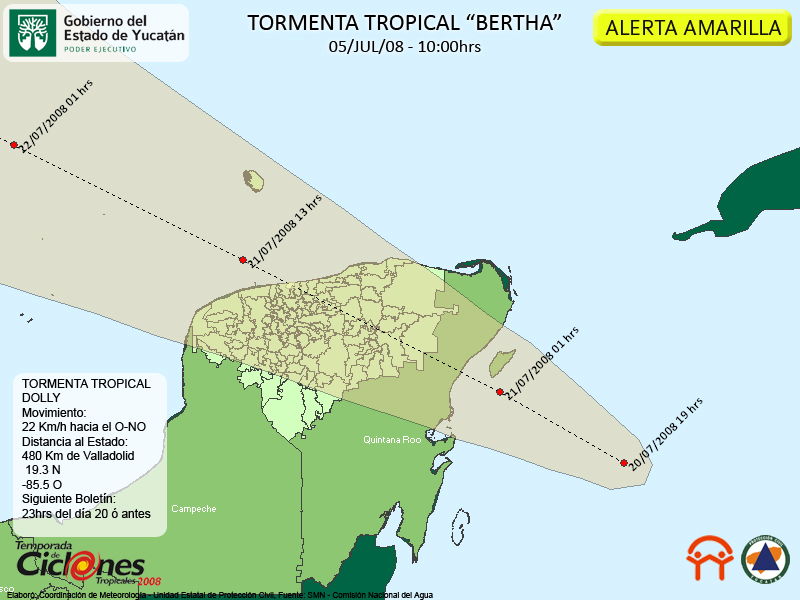 La Tormenta Tropical "DOLLY" continúa su rápido desplazamiento por el Mar Caribe, se decreta Alerta Amarilla de Tormenta Tropical como medida de prevención para el Estado de Yucatán.