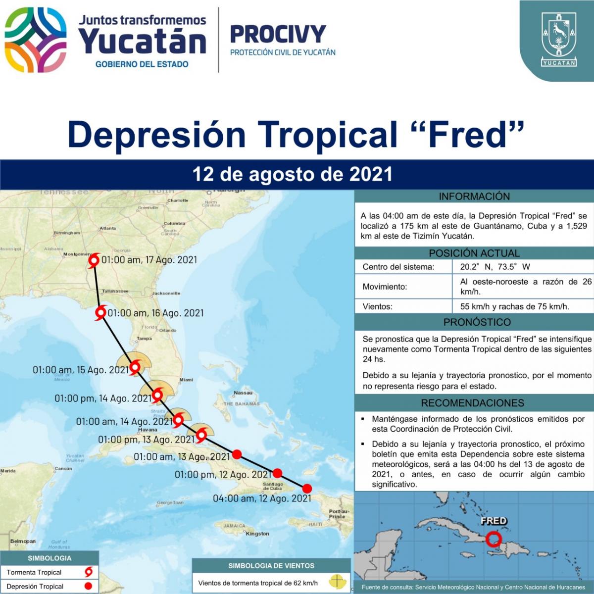 La Depresión Tropical Fred, se localiza a 175 km al este de Guantánamo, Cuba.