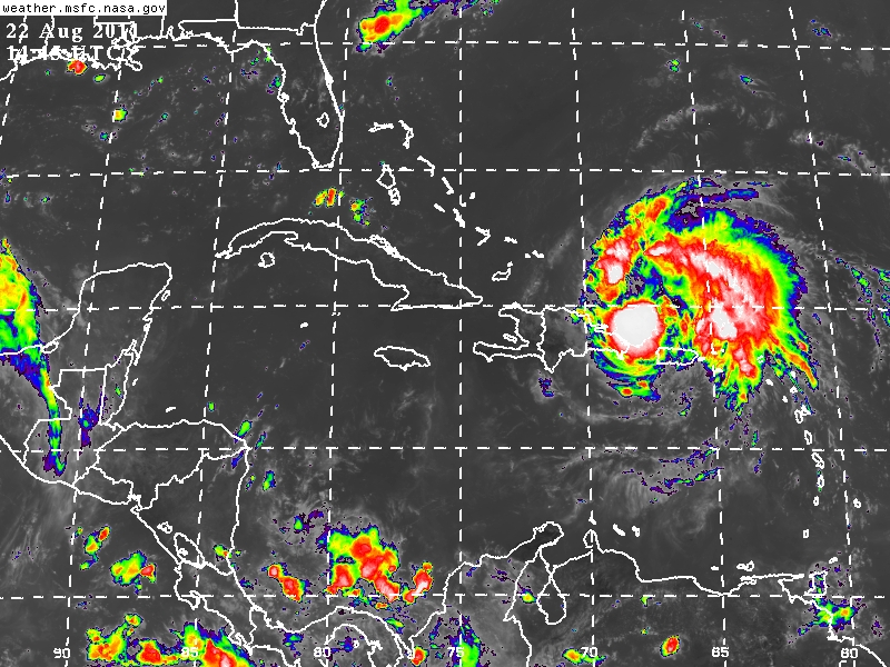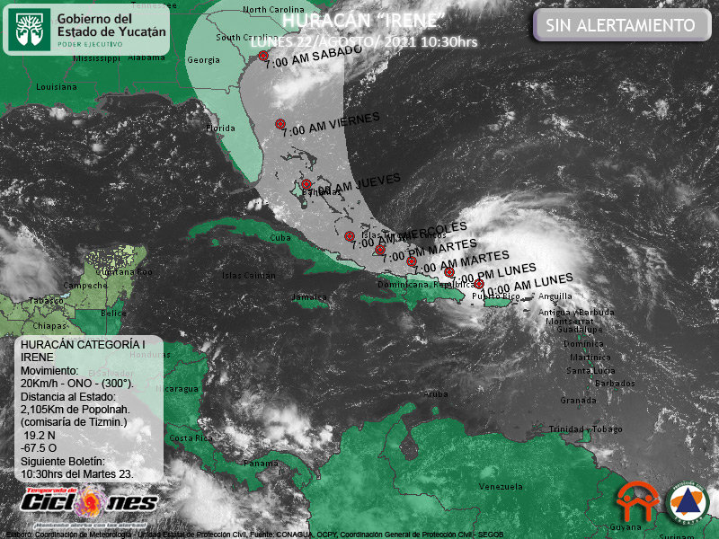 El Centro del Huracán Irene se estima esta mañana a 115Km al Noreste de Punta Cana, República Dominicana, 2,105Km al Este de Popolnah, Comisaría de Tizimin, Yucatán. Vientos de Tormenta Tropical se extienden hasta 165Km al Noreste de su Centro, por lo que los vientos son estimados a 1,940Km de Popolnah, Comisaría de Tizimin.