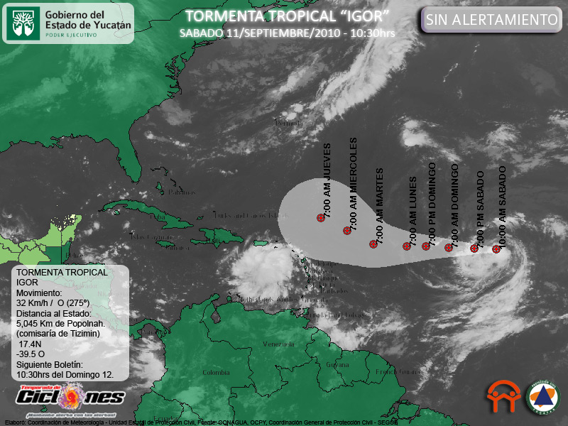 En el escenario presentado hoy Sabado por la mañana, Igor muestra una trayectoria pronóstico en la cual, la Península de Yucatán y el Mar Caribe se encuentran fuera de Peligro por el momento.