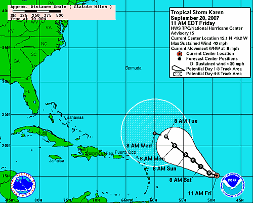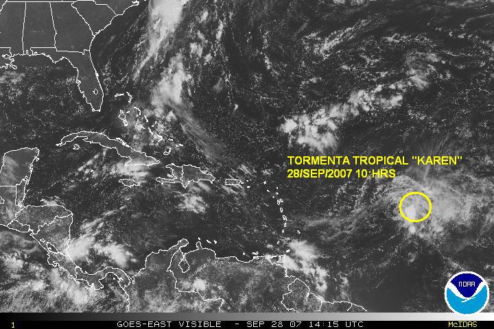 Se espera que Karen continúe debilitandose durante el día de hoy, debido a que se encuentra en una zona desfavorable para su desarrollo a causa de fuertes vientos en los niveles altos de la atmosfera.