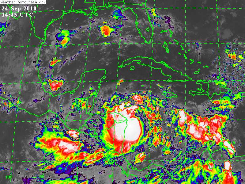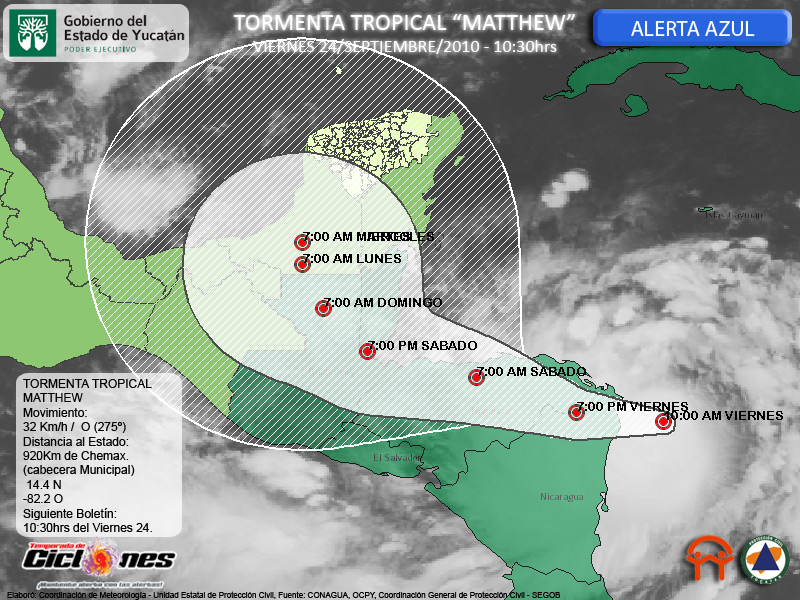 La Tormenta Tropical Matthew continúa con su desplazamiento hacia el Oeste, aproximandose hacia el Norte de Nicaragua, su centro se estima a 125Km al Este-Sureste de Cabo Gracias a Dios en la frontera de Nicaragua y Honduras, 790Km de Chetumal, Quintana Roo y 920Km de la Cabecera Municipal de Chemax, Yucatán.