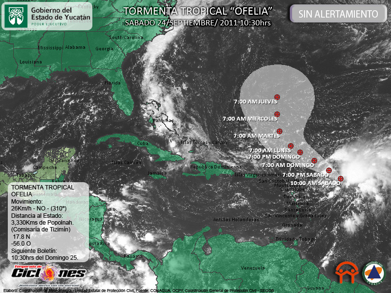 La Tormenta Tropical Ofelia continúa esta mañana sin amenazar a las Antillas con un desplazamiento hacia el Noroeste en congruencia con los pronósticos, el Centro de la Tormenta Tropical es estimado esta mañana a 620Kms de las Islas Leward, 3,330Kms de Popolnah Comisaría de Tizimín, Yucatán.