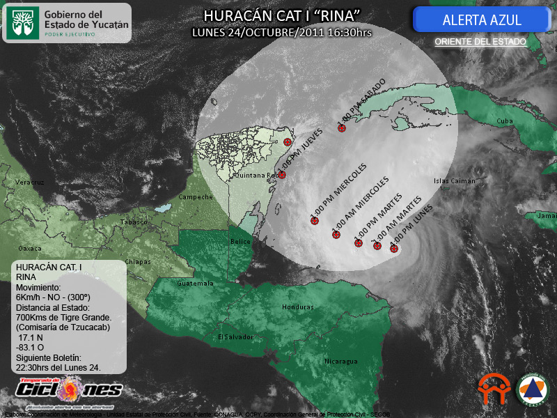 El Centro de Rina se estima esta tarde a 570Kms al Este-Sureste de Chetumal, Quintana Roo, 690Kms de Tigre Grande comisaría de Tzucacab al Sur del Estado de Yucatán.