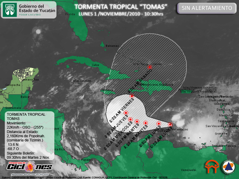 Tomas se debilita, es ahora una Tormenta Tropical y se encuentra a 2,080Km de Cozumel, Quintana Roo, 2,160Km de Popolnah, Comisaría de Tizimín, vientos de Tormenta Tropical se extienden hasta 75Km al Noroeste del Sistema, por lo que vientos de tormenta se encuentran a 2,095Km de nuestra entidad.