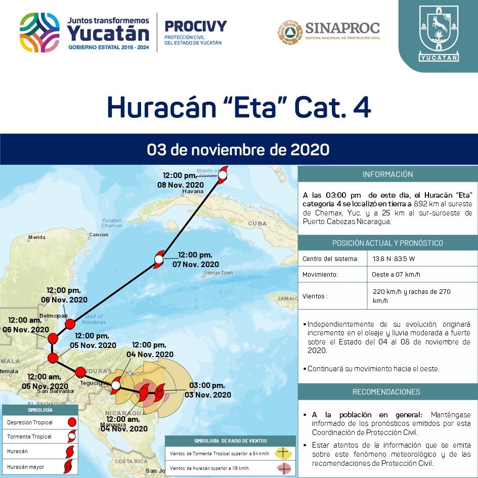 El Huracán "Eta" categoría 4; se localiza en tierra a 25 km al sur-suroeste de Puerto Cabezas, Nicaragua.