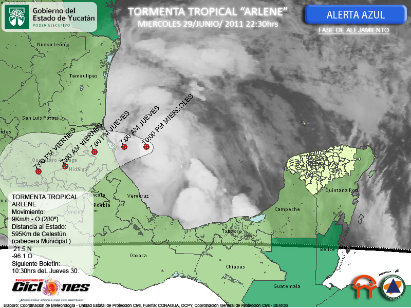 El Centro de Arlene es estimado esta noche a 595Km al Oeste-Noroeste de Celestún, 630Km de Sisal, comisaría de Hunucmá y a 145Km al Este, Noreste de Tuxpan, Veracruz.