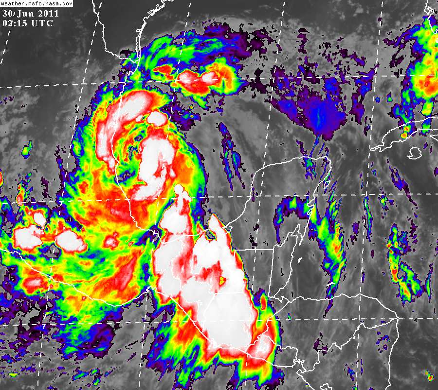 Arlene presenta una amplia zona de actividad convectiva asociada, por lo que son evidentes desprendimientos nubosos que favorecen precipitaciones en relación con este sistema en todo el Sur y Sureste del País, incluida la Península de Yucatán.