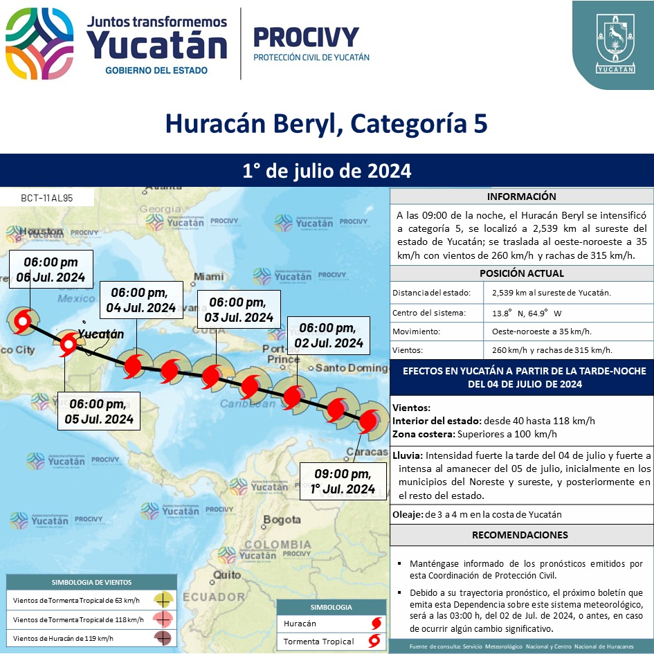 SE ESPERAN LOS SIGUIENTES EFECTOS EN EL ESTADO DE YUCATÁN A PARTIR DE LA TARDE DEL 4 DE JULIO DE 2024.