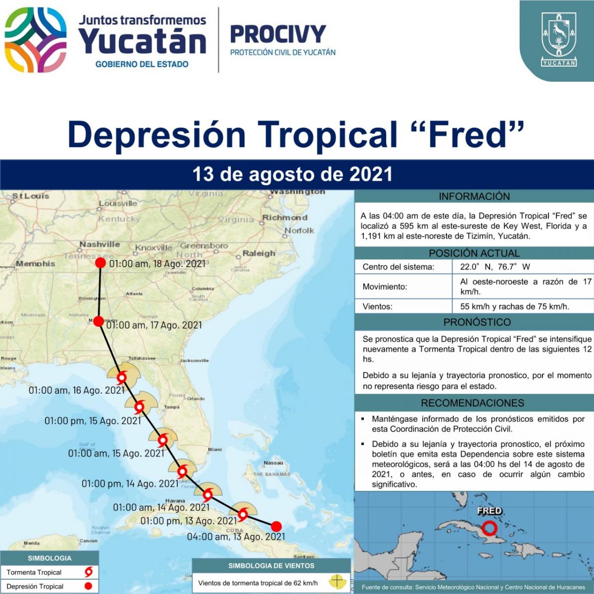 La Depresión Tropical #Fred, se localiza a 595 km al este-sureste de Key West, Florida, E.U.A. y a 1,191 km al este-noreste de Tizimín, Yucatán.