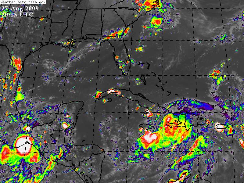 Gustav continúa con su lento desplazamiento en el Caribe, muestra nubosidad dispersa y se debilita ligeramente durante las últimas horas.