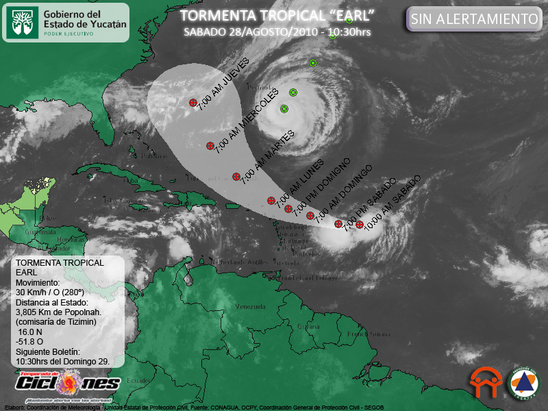 a pesar de que la Tormenta Tropical Earl ha continuado con un movimiento general hacia el Oeste, se espera que en el próximo par de días presente un desplazamiento hacia el Oeste-Noroeste ó Noroeste, lo que llevaría al Mar Caribe y la Península de Yucatán aún mas lejos de la trayectoria de Earl.