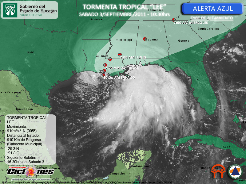 El Centro de la Tormenta Tropical se estima esta mañana a 75Kms al Suroeste de Morgan City Luisiana, 910Kms del Malecón Internacional de Progreso, Yucatán.