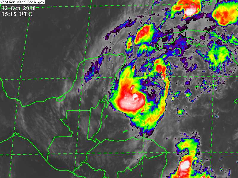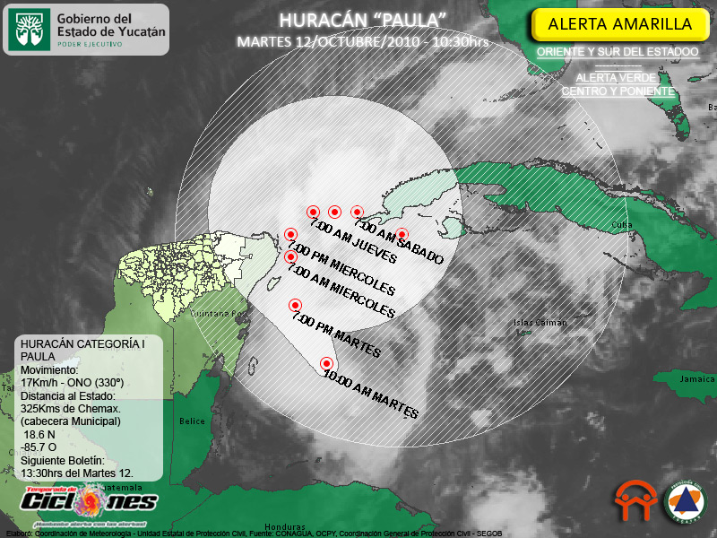 Paula continúa como un huracán de Categoría uno, con vientos de 120Km/h y rachas de hasta 150Km/h El Centro del Huracán es estimado a 270 Km al Este de Chetumal, Quintana Roo, y a 325Km de la Cabecera Municipal de Chemax, Yucatán.