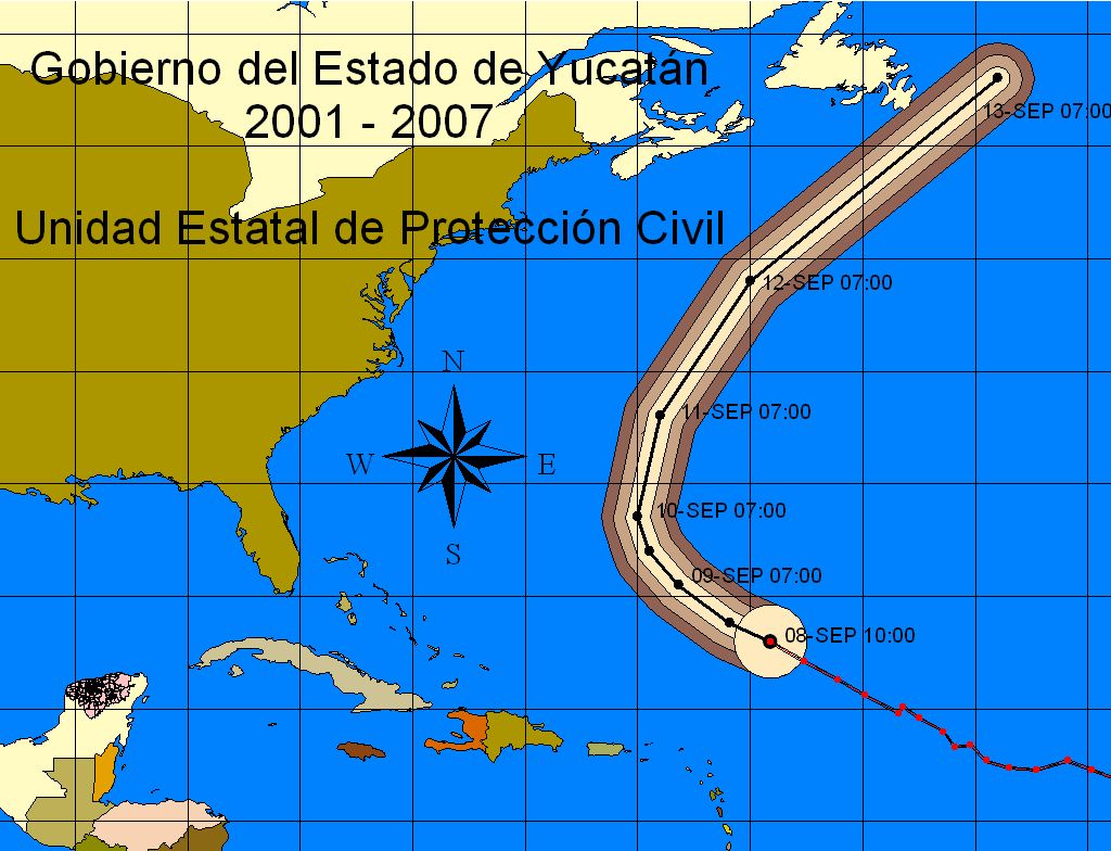 Distancia del centro de la tormenta tropical al Estado de Yucatán: 2,934 Kms. de San Arturo, Tizimín