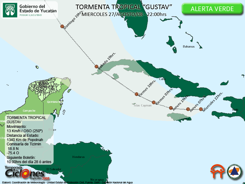 Se espera que Gustav continúe con un desplazamiento general hacia el Oeste durante el día de mañana y hacia el Oeste-Noroeste el día Viernes.