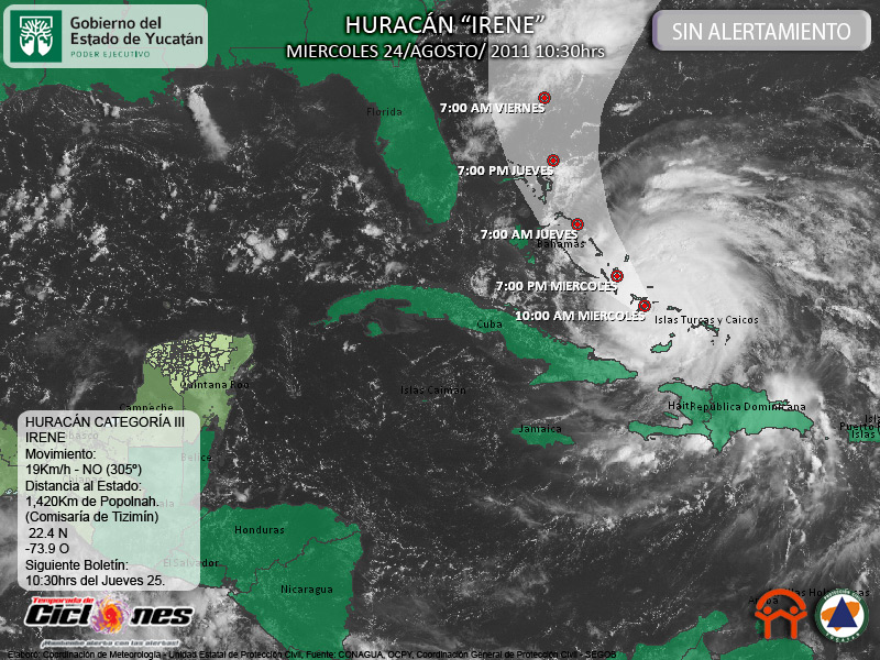 Irene presenta un desplazamiento de acuerdo a los pronósticos, su centro se estima esta mañana a 160Km al Sureste de Long Island, Bahamas; 1,420Km de Popolnah, Comisaría de Tizimín, Yucatán.