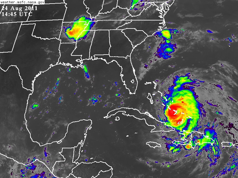 El Huracán Irene sobre las Bahamas de Categoría III, con vientos sostenidos de 185Km/h se convierte en el primer Huracán Mayor de la Temporada 2011 en el Océano Atlántico, Mar Caribe y Golfo de México.