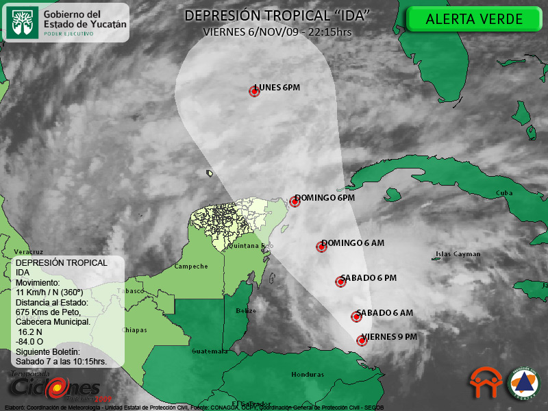 El Centro de la Depresión Tropical IDA se estima a 520 Kms de Chetumal, Quintana Roo y a 675 Kms de la Cabecera Municipal de Peto.