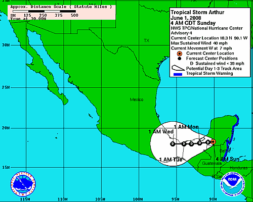 "ARTHUR" aún permanece esta mañana con fuerza de Tormenta Tropical, mientras continúa afectando con vientos y lluvia a la Península de Yucatán y centroamerica.