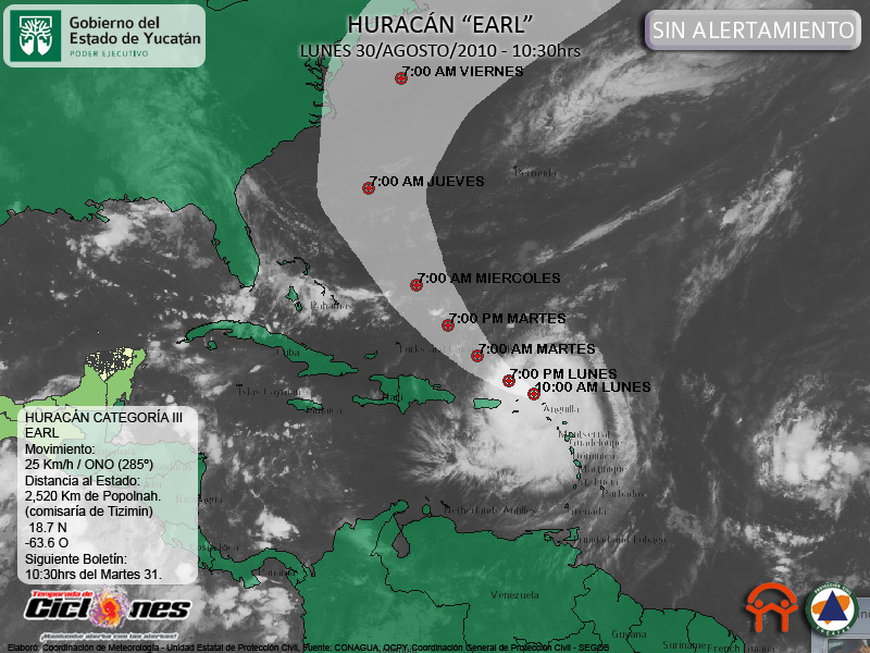 Earl no representa Peligro para nuestra entidad aún en el peór de los escenarios planteados la mañana de hoy Lunes, sin embargo, se mantiene el monitoréo permanente de este sistema por cualquier cambio inesperado que pudiera presentar