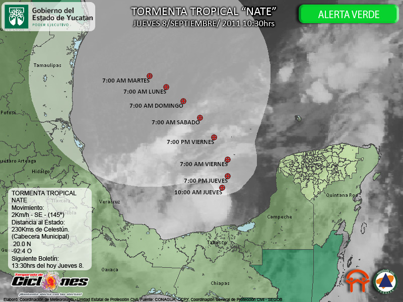 La Tormenta Tropical Nate presenta un movimiento prácticamente estacionario hacia el Sureste a razón de 2Km/h sobre la Bahía de Campeche. El Centro de la Tormenta Tropical se estima a 230Kms de Celestún Yucatán, sin embargo, vientos de Tormenta Tropical se extienden hasta 85Km hacia el Noreste del Centro, cuadrante correspondiente a nuestra entidad, por lo que vientos de Tormenta Tropical se estiman a 145Kms de Celestún.