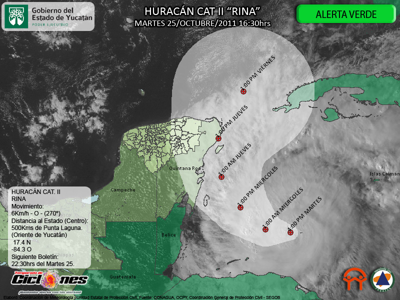 El Huracán Rina se mantiene esta tarde en la Categoría DOS en la Escala Saffir Simpson ligeramente más intenso, ahora con vientos sostenidos de 175Km/h y rachas de hasta 215Km/h, el Centro de Rina se estima a 440Kms de Cozumel, Quintana Roo, 500Kms de Punta Laguna en el Oriente del Estado de Yucatán.