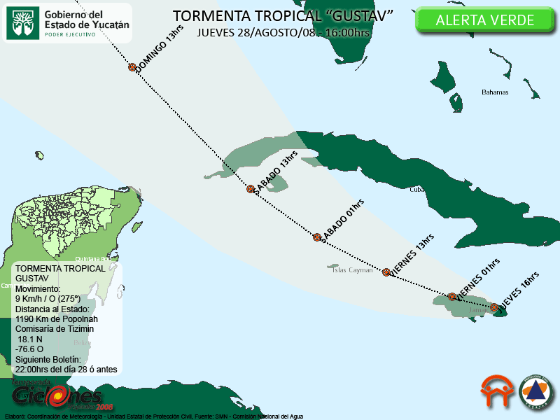 Distancia del centro de la tormenta tropical al Estado de Yucatán: 1190 Kms. de Popolnah, comisaría de Tizimin