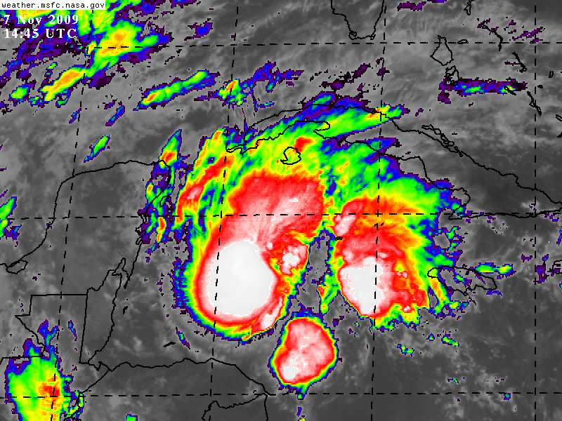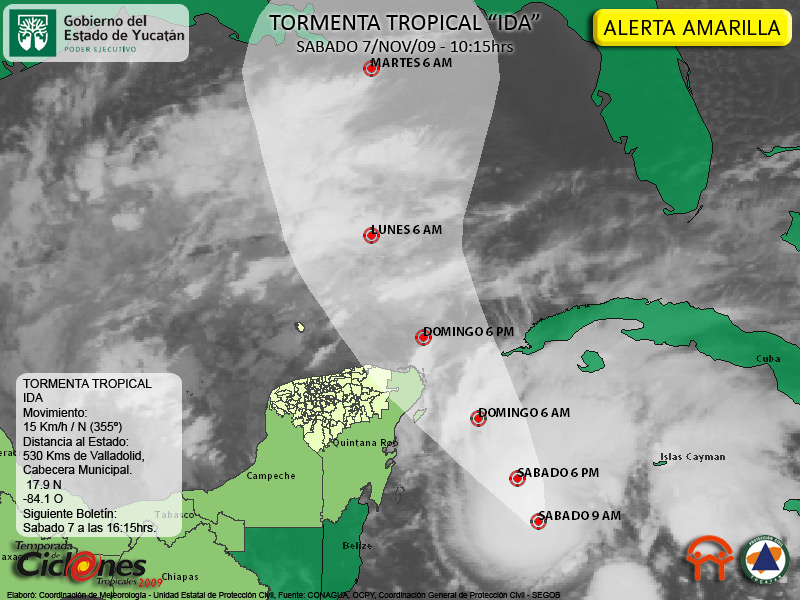 La mañana de hoy Sabado la Tormenta Tropical IDA se ha intensificado en intensidad de vientos, como en el diametro de los mismos, alcanza vientos sostenidos de 95 Kms/hrs mientras se desplaza hacia el Norte sobre el Mar Caribe.