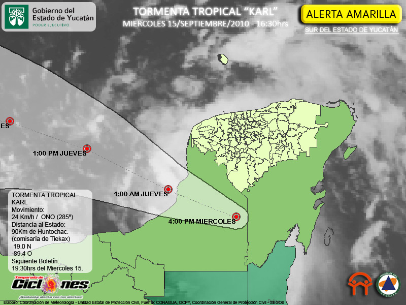 Karl comienza a debilitarse, pero continúa como una Tormenta Tropical con vientos de 75Km/h se encuentra a 155Km al Sureste de Campeche, Campeche, 90 Km de Huntochac, Comisaría de Tekax.