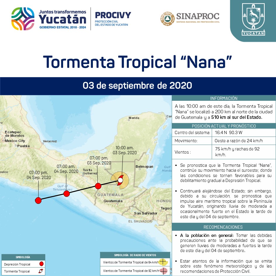 La Tormenta Tropical "Nana"; se localiza en tierra a 200 km al norte de la ciudad de Guatemala.
