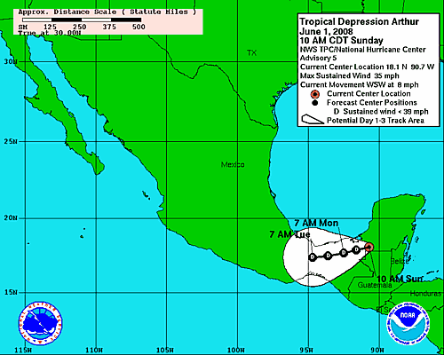 "ARTHUR" Continuará con su desplazamiento sobre tierra en el Sur de Campeche, aún existe potencial de que se presenten chubascos intensos de manera aislada en el interior del Estado, con algunos vientos.