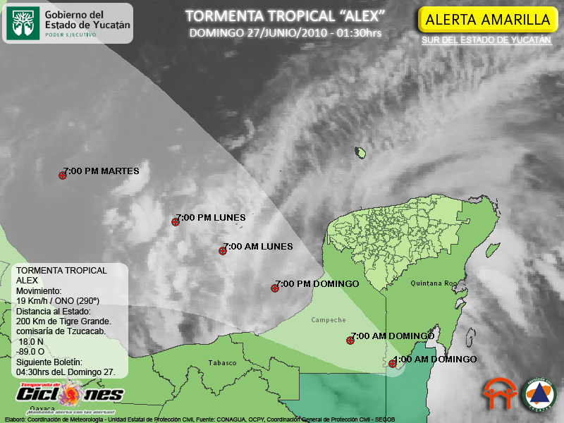 Se espera que Alex se debilite a Depresión Tropical en las próximas horas, y contínúe con su desplazamiento sobre la Península de Yucatán durante hoy Domingo, emergiendo sobre el Golfo de México durante las últimas horas de la tarde.